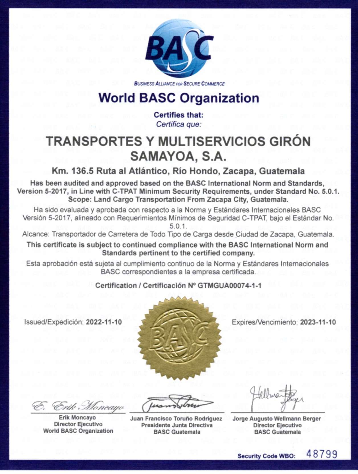 Transportes y Multiservicios Girón Samayoa, S.A. aplica la seguridad integral en todos y cada uno de sus procedimientos administrativos y operativos, desarrollando una cultura de prevención de seguridad, minimizando cualquier tipo de actividad ilícita, como robo, terrorismo, narcotráfico, y delitos conexos, que pueden afectar directamente la cadena de suministro de sus operaciones en el servicio que presta a sus asociados de Negocios